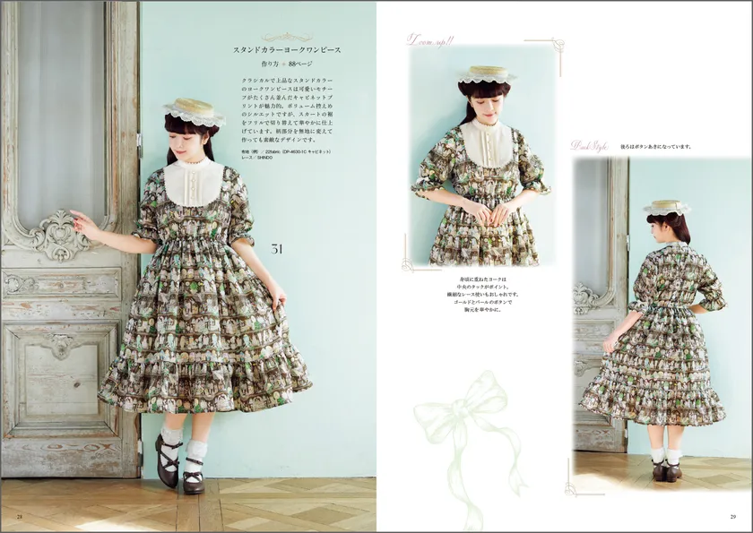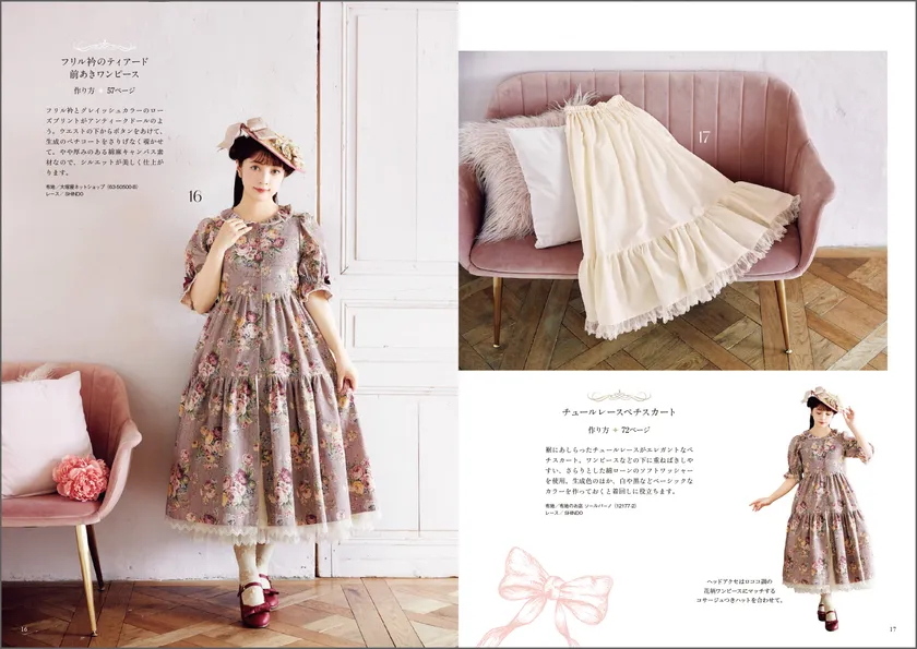 できるだけ作りやすくて、オールシーズン楽しめる、日常的に着やすいシルエットにこだわったという青木美沙子さん。全体的に着丈を長めにし、袖もひじが隠れる上品な袖丈や長袖、スカートのシルエットはパニエがあってもなしでも楽しめるデザインに。小物は可愛らしさだけでなく使い勝手の良さや収納力も◎。また、使用する布地やレース、リボンなどもデザインイメージや雰囲気に合うものをチョイスしていただきました。