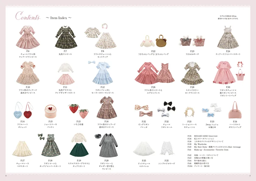 ワンピースを中心にブラウス、スカート、ジャンパースカート、バッグ、ポーチ、ヘアアクセなど普段使いしやすいデザインをアイテム豊富に合計44点掲載。