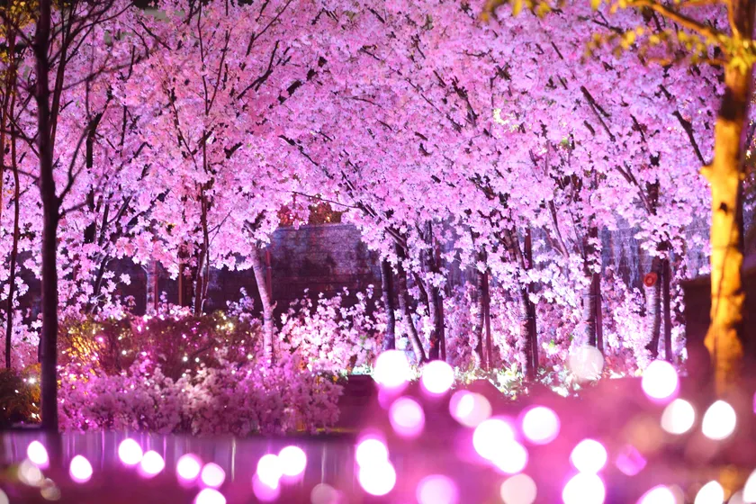 夜は、ピンクのイルミネーションやサクラをイメージしたピンク色のライトが輝きます。