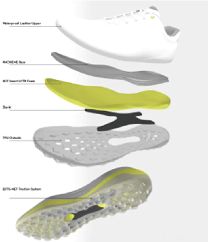 プレイ時に必要なパフォーマンスと快適性を叶えるための最新技術LYTR(ライター)テクノロジーは、異なる素材をECCO独自の一体成型技術(FLUIDFORM(TM)(フルイドフォルム)テクノロジー)と融合させることでこれまでにない新しい感覚の履き心地を高次元で実現しました。高反発軽量素材PHOREN(TM)(フォーレーン)は弾力性と軽量性を、EVA(イーヴイエー)は柔軟性を、耐久性に富むTPUアウトソールのE-DTS NET(イーディーティーエスネット)は多方面のトラクションと優れたグリップ力を叶えます。それぞれの素材が持つ機能性を人間の足裏の凹凸にピッタリフィットする独自の成型技術により機能性と快適性を叶え、歩行性とスウィング時のパフォーマンスをサポートします。