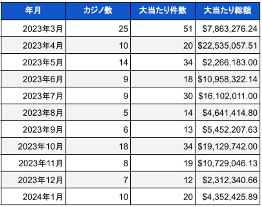 2024年1月は10店舗のカジノでジャックポット当選が20件以上出ており、当選総額は435万ドル(日本円で約6億円以上)でした。