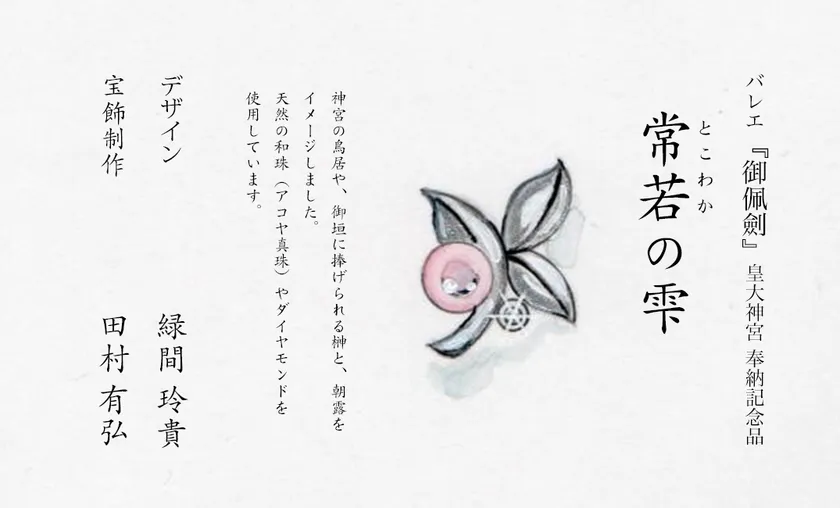 緑間の初デザイン作品「常若の雫」は、バレエ「御佩劍」の神宮奉納記念品として制作しました。3月23日から銀座で開催する企画展「【A.C.T.Y plains × トコイリヤ】 田村有弘(宝飾)と緑間玲貴(バレエ)の共創」にて一般公開します。