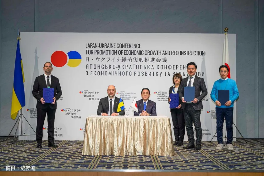 〈写真:中央左から ウクライナ・シュミハリ首相 日本・岸田総理 右端 当社COO飯田國大〉