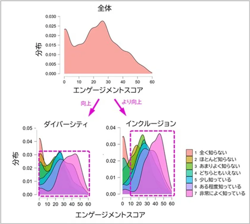 図5.エンゲージメントスコアの全体分布と「ダイバーシティ」「インクルージョン」の認知度別の分布