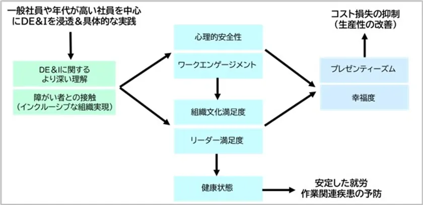 パフォーマンス指標との関連については、DE&Iの用語の認知度および障がい者との接触頻度が高いほど、人的資本指標が高いことが明らかになりました。またリーダーへの満足度が高いと健康状態が良いこと、組織文化やリーダーへの満足度が高いとパフォーマンス指標が高いことが明らかとなりました。DE&Iに関する深い理解を醸成し、インクルージョンを実践することが組織文化やリーダー満足度の向上につながり、これらの媒介として健康状態やプレゼンティーズム、幸福度が改善する可能性が示されました。(図7)