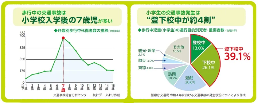 小学校入学後の7歳児の交通事故が多くなるのは、登下校や放課後の遊びなど、子どもだけの「ひとり行動」が増えることが1つの要因です。警察庁の調査によると、小学生の歩行中の交通事故は約4割が「登下校中」に発生※1しています。子どもの「ひとり行動」が増える一方で、十分な交通ルールや危険性の理解が伴っておらず、状況判断しながら安全に行動することが難しい状況のため、交通事故へつながる可能性が高まります。