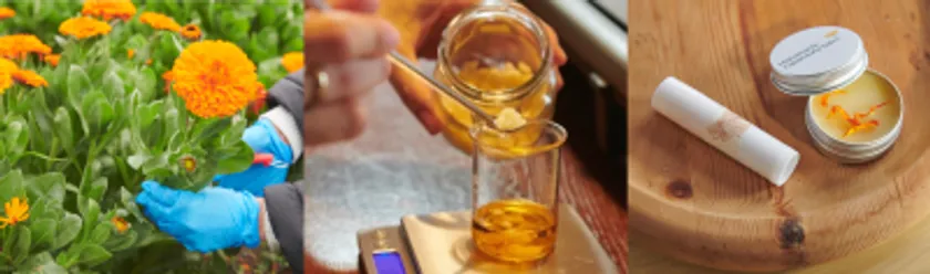 太陽の光をたっぷり浴びて育ったカレンデュラ。摘んだ花は持ち帰り、飾るもよし、食べるもよし、ご夫妻が丁寧に活用方法を教えてくれます。開花時期のワークショップは、通常のリップバーム、スキンケアバーム、化粧水の3種のコスメ作りに加え、近隣のレストランでカレンデュラを使用したメニューを味わえるランチ付きのプランを提供しています。