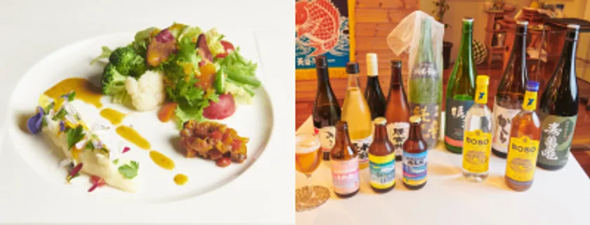 色鮮やかな鴨川産エディブルフラワーと旬野菜のサラダ/鴨川クラフトビール、地酒、自家製ジュースなどドリンクのラインナップも充実