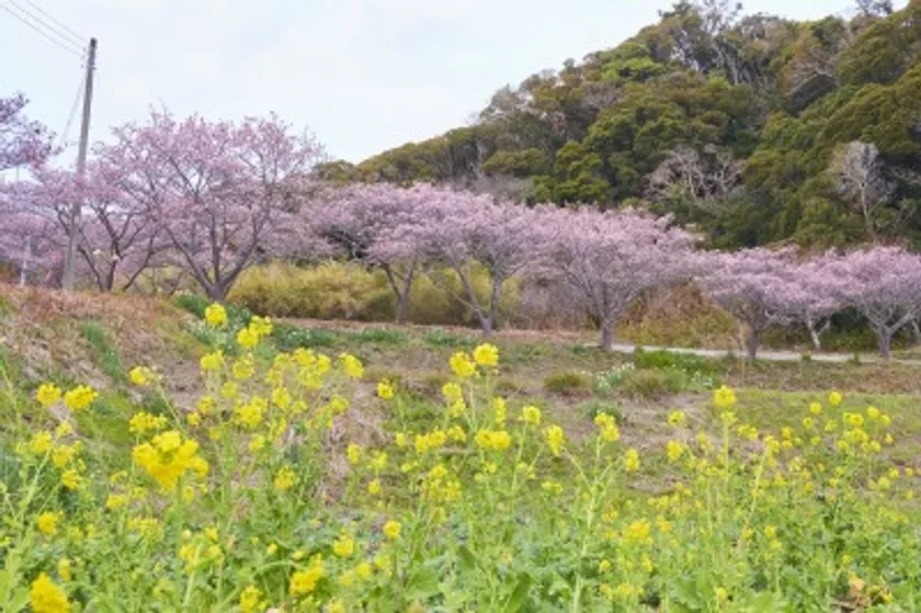 安房地域の花栽培は、1919年(大正8年)に館山まで鉄道が開通したことをきっかけに、現在の南房総市で生まれ育った間宮七郎平(まみやしちろうべい/1893~1958年)が、実家の農業に自身の薬剤師としてのスキルを活かして花の栽培と出荷に成功したことが始まりと言われています。そして、半農半漁で暮らしていた人々を苦しい生活から救ったそうです。太平洋戦争後には町の農業会長となった七郎平が尽力し、1953年(昭和28年)に天皇皇后両陛下が和田町の花づくりをご覧になったことで、再びこの地域で花が栽培されるようになりました。そんな七郎平が自ら鍬を持ち山を切り開いた「抱湖園」には寒桜が植えられ、旧暦の元旦朝に開花することから「元朝(がんちょう)桜」と呼ばれています。1月下旬~2月中下旬に見頃を迎え、菜の花とともに美しい景色を楽しめます。