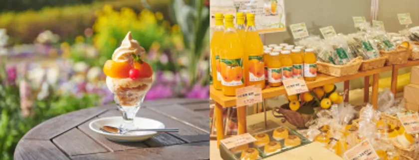 季節の花々を見ながらのんびりと過ごせるカフェ。びわソフトに房州びわのシロップ漬けをトッピングした「びわパフェ」や、びわピューレでコクを出した「びわカレー」など、ここでしか味わえないメニューをどうぞ。