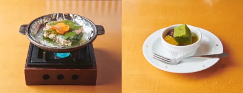 熟練の寿司職人である大将と、洋食の料理人として有名ホテルで修行したシェフの父子が奏でる「和」と「洋」のマリアージュ。こだわり抜いた房総の食材を用いる料理の数々には、ストック、菜の花、サフラン、カレンデュラなどの食用花(エディブルフラワー)が添えられ、味だけなく見た目もとても華やかです。