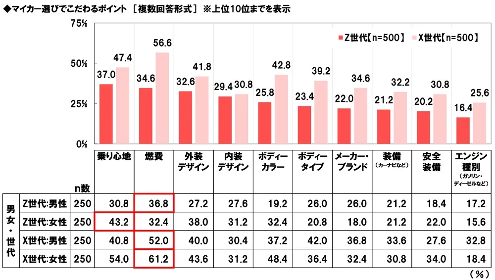 男女・世代別にみると、Z世代の男性とX世代の男性、X世代の女性では「燃費」(順に36.8%、52.0%、61.2%)が1位となったのに対し、Z世代の女性では「乗り心地」(43.2%)が1位となりました。