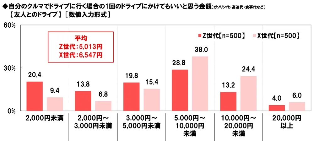 【友人とのドライブ】(1回)にかけてもいいと思う金額を聞いたところ、Z世代(500名)、X世代(500名)ともに「5,000円~10,000円未満」(Z世代28.8%、X世代38.0%)に多くの回答が集まりました。