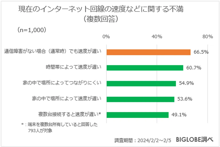 全国の20代から60代の男女1,000人に「現在のインターネット回線の速度などに関する不満」を質問したところ、「通信障害がない場合(通常時)でも速度が遅い」と回答した人の割合が全体の66.5%と7割弱となった。