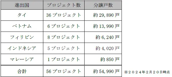 なお、本プロジェクトにより、当社のインドネシアにおける住宅分譲事業は5プロジェクト(約4,020戸)、また海外における住宅分譲事業全体は56プロジェクト(約54,990戸)となります。