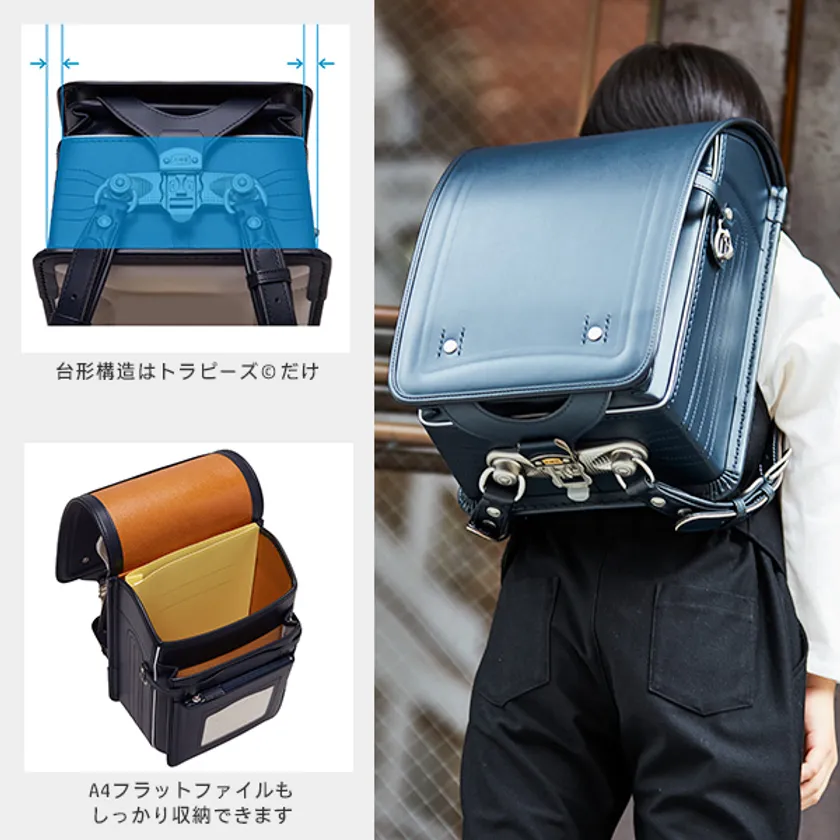 オオバランドセルだけの特許形状「トラピーズ(C)」は、背中側の幅を広げA4フラットファイルがしっかり収納可能に。一方、フタ側はそれよりもやや狭くすることにより、お子さまが背負った姿がスタイリッシュに見えるフォルム。