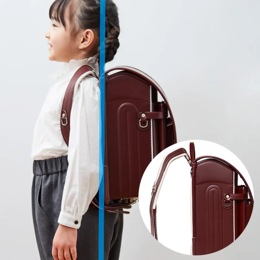 ふっくらとしたカブセのシルエット、オオバランドセル独自の特許形状により、お子さまが背負った姿がスタイリッシュに。熟練職人の手仕事が活きた美しいフォルムは、見た目にもこだわる本物志向の親御様からの支持が厚いオオバランドセルの特徴です。