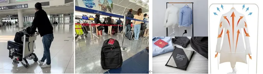 ホテル・家庭にあるドライヤー・ふとん乾燥機を利用して、複数の衣類を最短10分で乾燥することが可能。シワ取り効果あり。