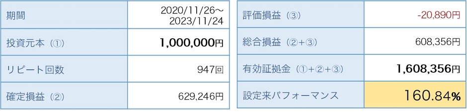 株式会社マネースクエア(本社:東京都港区、代表取締役会長兼社長:相葉 斉、以下「当社」といいます。)は、この度、当社が提供する「トラリピ戦略リスト」における「オージーキウイ(豪ドル/ニュージーランドドル)ダイヤモンド戦略」が、2020年11月26日から2023年11月24日までの3年間に記録した運用実績を公開しましたので、お知らせいたします。