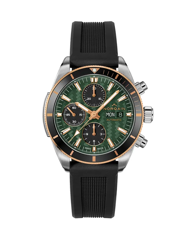 Adventure Sport Chrono Day/Date 41mm Limited Editionは、グリーンの文字盤にスイスの山々をモチーフにした「NORQAINパターン」が施されます。3時位置にデイ/デイト表示、6時、9時、12時位置に3つのブラックサブダイヤルを備え、サブダイヤルにはレッドゴールドのリングが施され、エレガントな要素を加えています。ケースはステンレススチール製で、18Kレッドゴールドのローレット加工が施されたベゼルには、レッドゴールドのマーカーで飾られたブラックアルミニウムリングが装着されています。世界限定100本モデル。