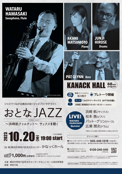 神奈川区民文化センターかなっくホール指定管理者主催、~浜崎航クァルテット~ サックスを聴く『おとなJAZZ』が2023年10月20日(金)に神奈川区民文化センターかなっくホール(神奈川県横浜市神奈川区東神奈川1-10-1)にて開催されます。