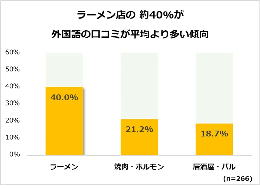 さらに、口コミを獲得している店舗の外国語の口コミ件数について、外国語の口コミが平均値より高い店舗はどの位あるのか業種別に調査を進めたところ、ラーメン店が最も高く、40%という結果になった<図3(2)>。