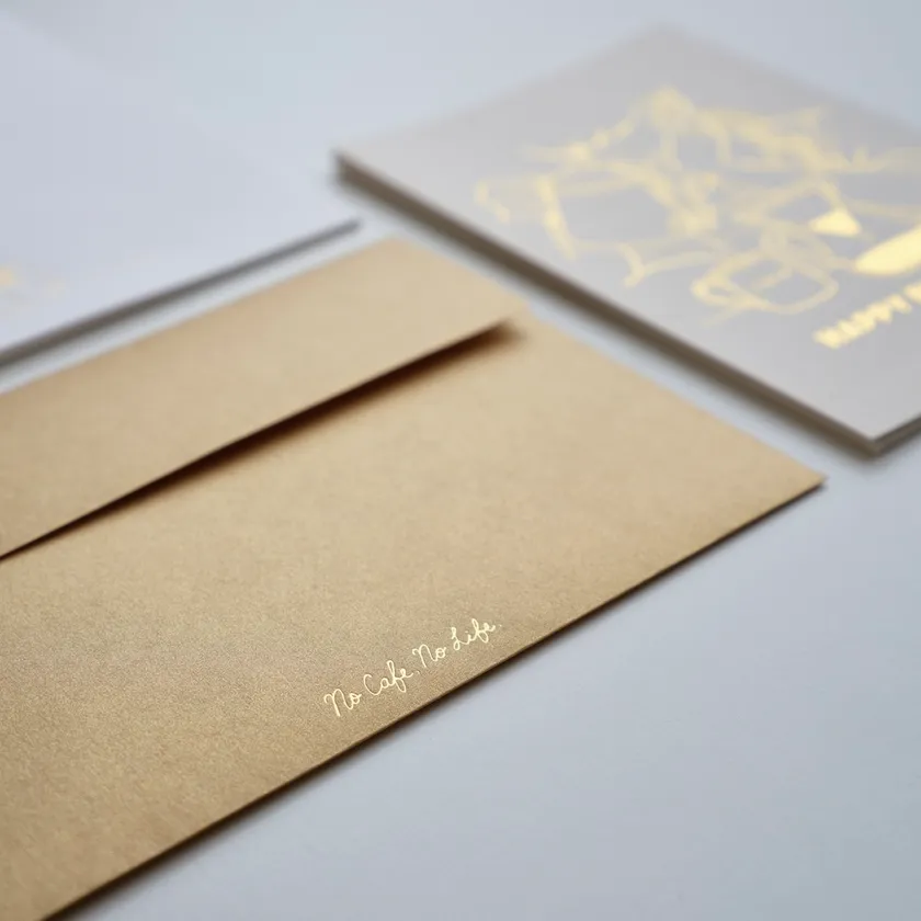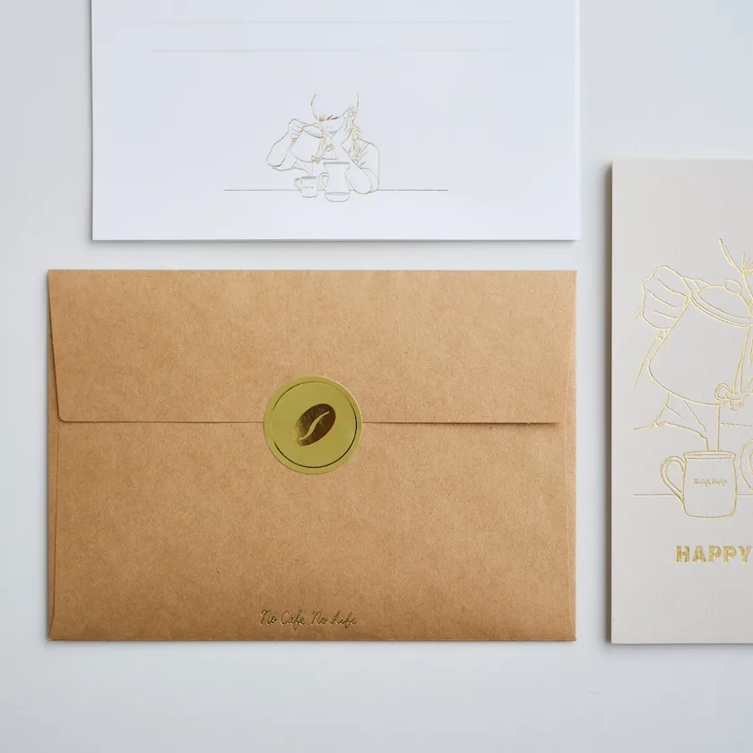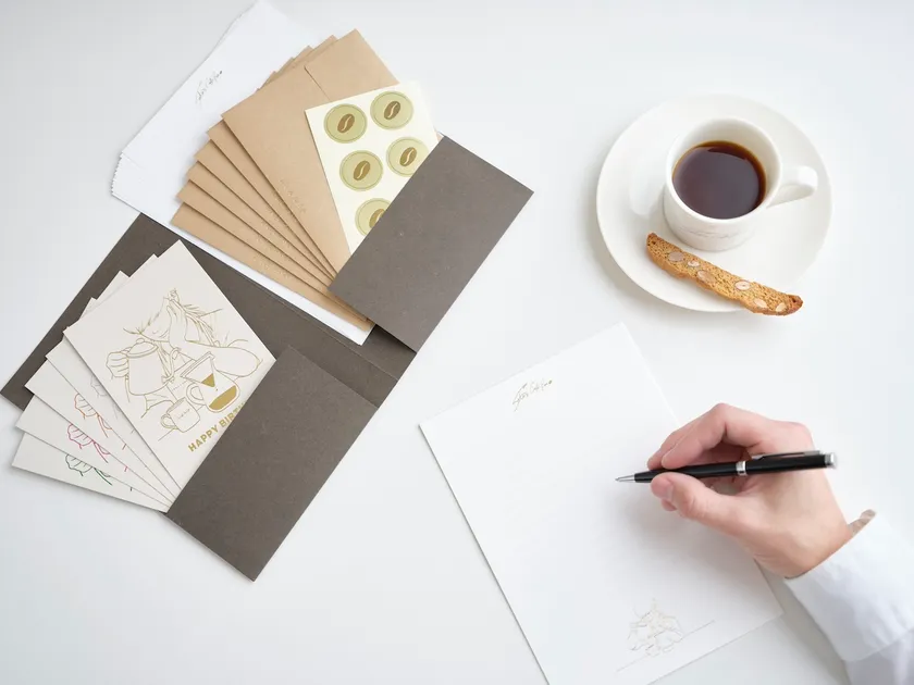 煌びやかにあしらわれた箔押しロゴ、厳選された紙素材は見て触れて楽しめる上質な仕上がりとなっており、「コーヒーの香りと共に想いを綴る」「届いた手紙を読む前にコーヒーを淹れる」といったように、大切な方とのコミュニケーションをより丁寧に、より特別なひと時へと演出します。