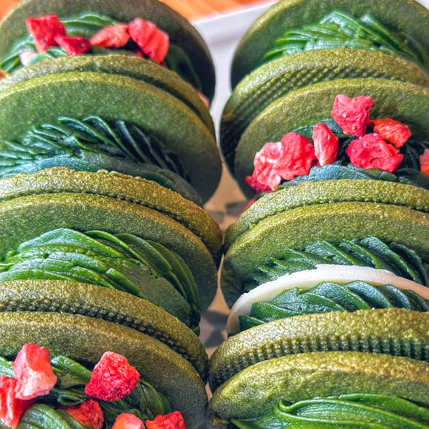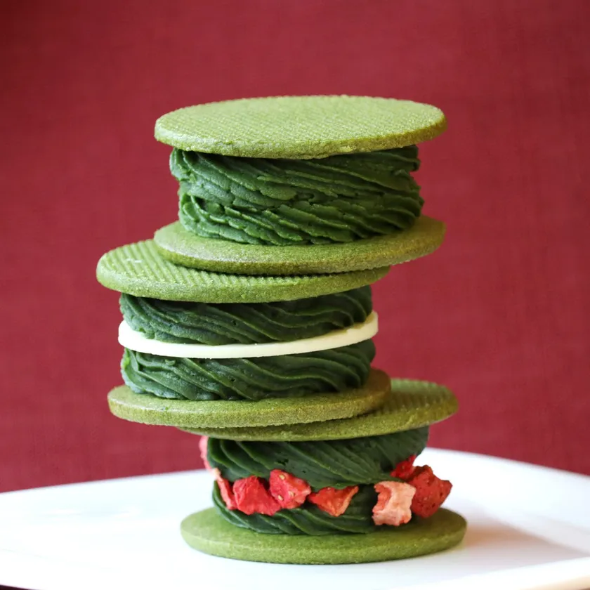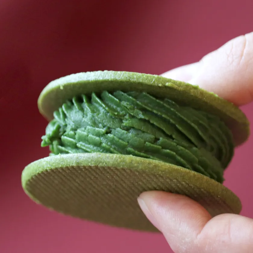 さくさく食感の抹茶クッキー生地に、大人な味わいの濃厚抹茶バタークリームをサンド。