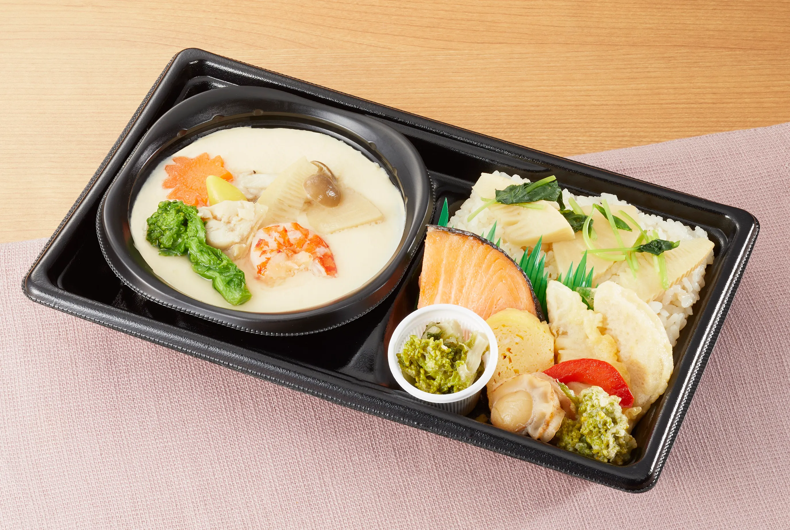 京料理の味付けを基本にしながら、旬の食材を生かしたお惣菜やお弁当を取り揃える<はな菊>。旬の竹の子、菜の花を使った春のお弁当。炊き込みご飯やてんぷら、和え物など素材の味をそのまま活かした品々です。自家製の具沢山な茶碗蒸とともに春をお楽しみいただけます。