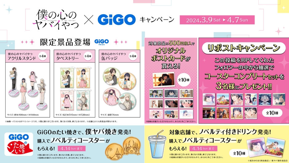 株式会社GENDA GiGO Entertainment(本社:東京都港区 代表取締役社長:二宮 一浩 以下、当社)は、GiGOグループのお店におきまして2024年3月9日(土)より、アニメ僕の心のヤバイやつ×GiGOグループのお店キャンペーン」を開催いたします。