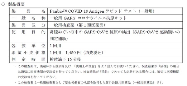 新型コロナウイルス感染症 OTC抗原定性検査キット 「PanbioTM COVID-19 Antigenラピッド テスト(一般用)」発売