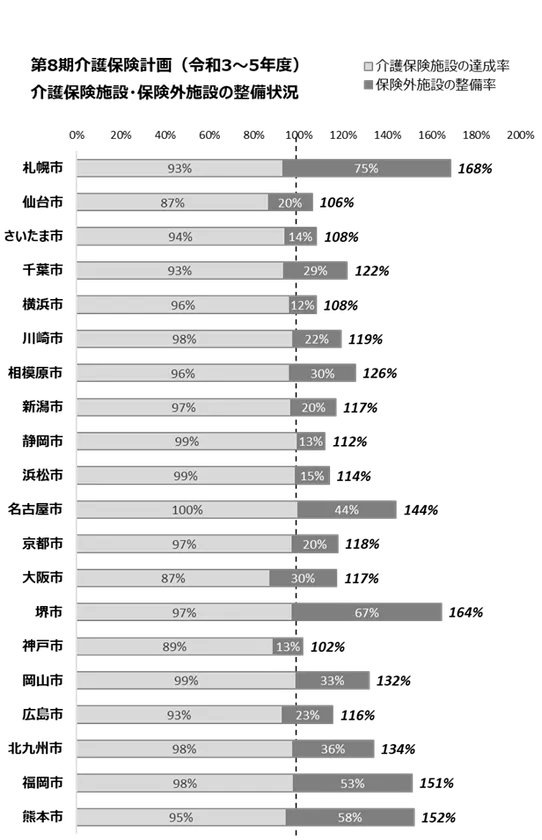 令和6年度 介護保険制度改正目前 政令指定都市 介護保険施設の整備計画は達成率95%。 ただし、保険外施設を含めると126%と供給過多の兆し。