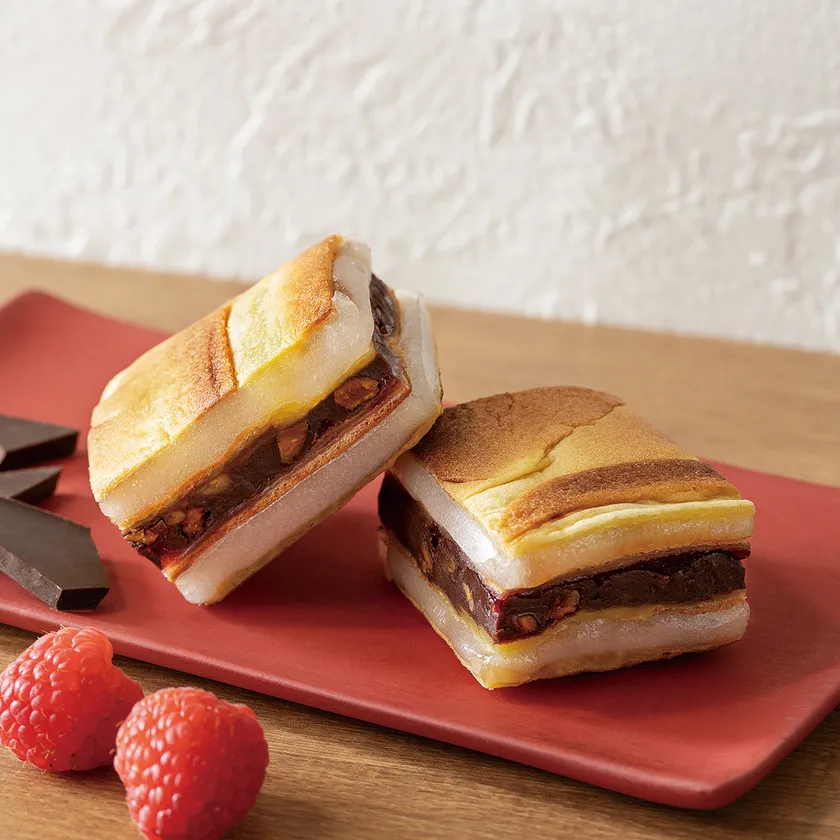 福井県 勝山を代表する名菓「羽二重くるみ」。濃厚なダークチョコレートガナッシュに、フランボワーズジャム、くるみとアーモンドを加え、オリジナル羽二重くるみの要素に、新たにゴディバらしさを盛り込んだ和洋折衷のお菓子です。