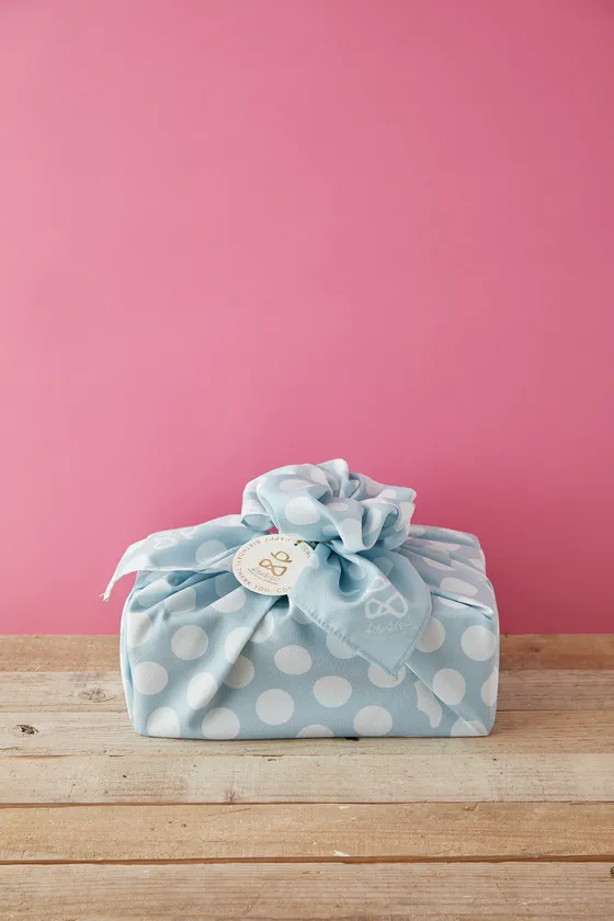 エコバッグにしたり、ボトルを包んだりと、さまざまな用途につかえるあしながおじさん/サヴァサヴァのオリジナルふろしきがデビューしました。公式オンラインショップ、直営店限定で購入できる特別なふろしきです。公式カラーの薄いブルーに大きめのドット柄がプリントされて、水玉の中には、パンプスのイラストやロゴマークが見え隠れ。90cm×90cmの大判ふろしきで、品物を包むだけでなく、色々な場面で活躍するふろしきです。