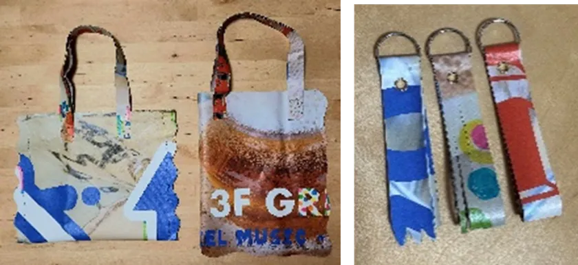 コピス吉祥寺の過去のイベントで使用したターポリン素材の広告バナーをアップサイクルした“エコバッグ&キーホルダーづくり”。
