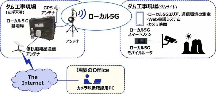 山岳エリアのダム建設現場において、ローカル5Gシステムと低軌道衛星通信を連接した情報通信インフラを利用し、建設現場に設置した4Kカメラの映像を、インターネットを介して現場事務所で視認できることを確認。