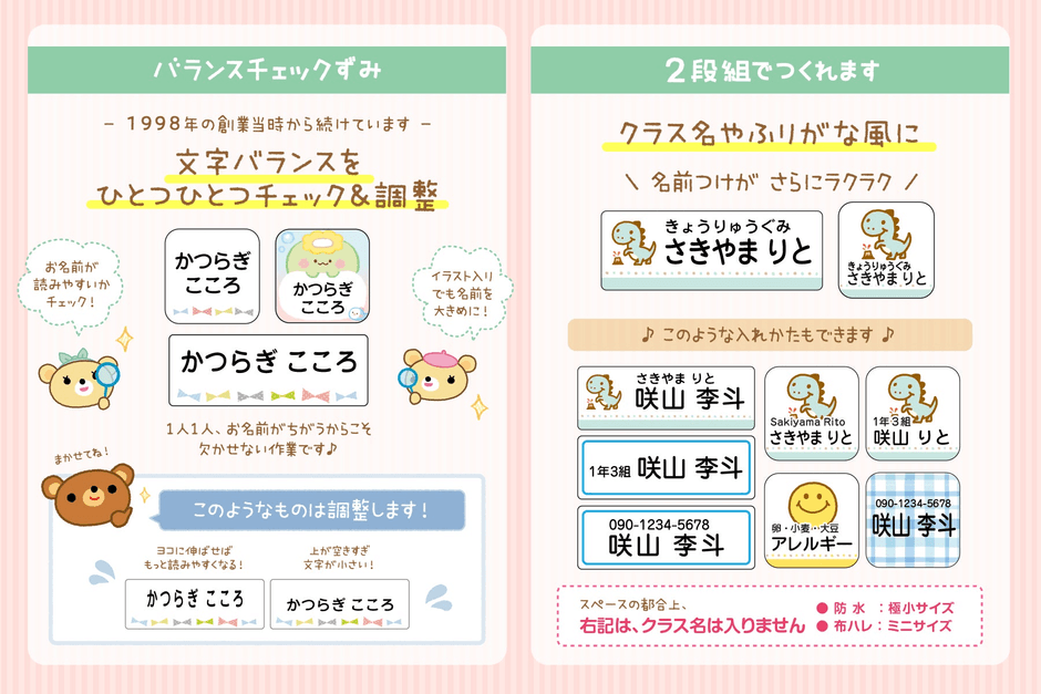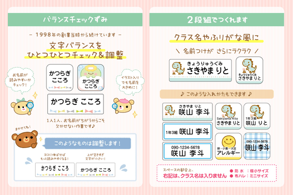 『毎日のお仕事や育児に追われている、パパ・ママのお手伝いが少しでもできれば…』という想いで、22年にわたり、お名前シールをはじめ名入れ商品の販売を通じて、仕事や育児に多忙な保護者のみなさまの入園・入学準備のお手伝いをしてまいりました。これからもさまざまなアイデアを発信し、名前つけをラクに楽しく、使う人々が笑顔になるアイテムを作り続けてまいります。