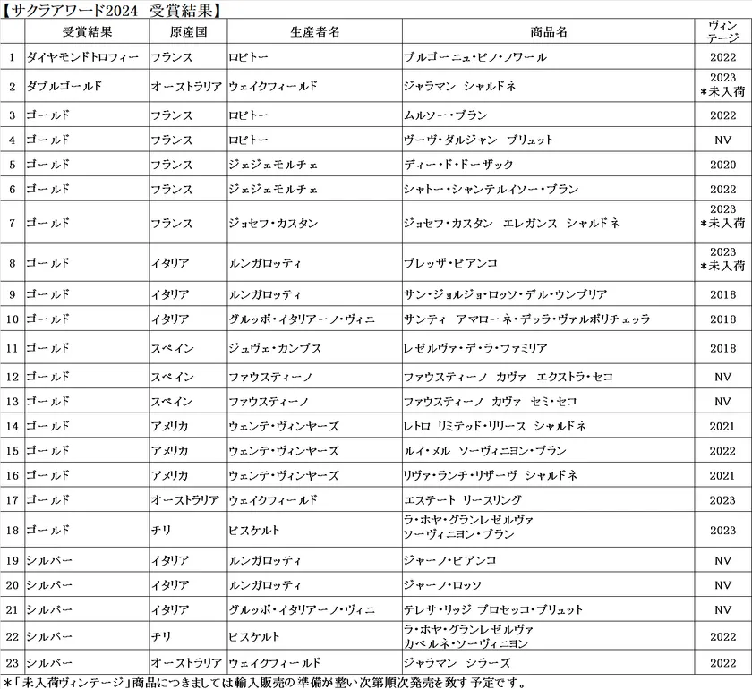 株式会社明治屋(本社:東京都中央区、代表取締役社長:磯野太市郎)は、第11回サクラアワード2024において当社直輸入ワインがダイヤモンドトロフィー1品を含む、合計23品が受賞いたしましたことをお知らせいたします。
