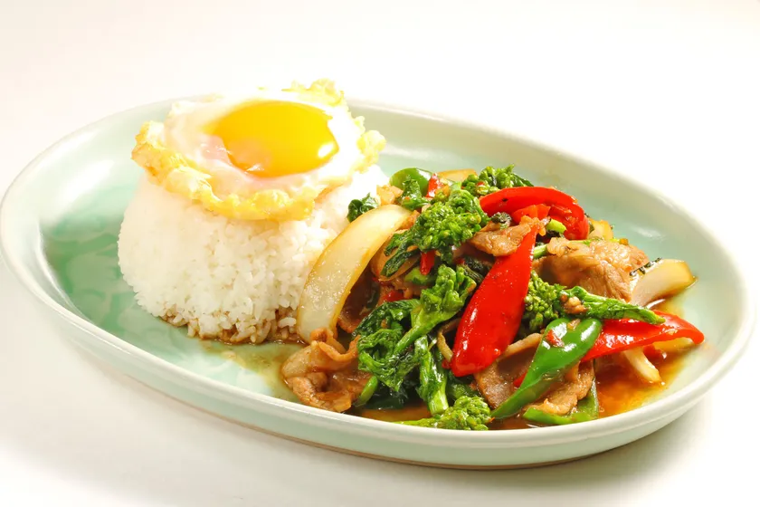 タイの屋台や食堂で人気No1メニューのガパオライス。当社では春の食材菜の花を使用して春の訪れを感じることの出来るメニューを開発しました。ビタミンたっぷりの菜の花と豚肉の相性が抜群!ホーリーバジルの香りも合わさり、さわやかな味わいとなっております。揚げた目玉焼きの黄身を混ぜながらお召し上がりいただきたい1品です。