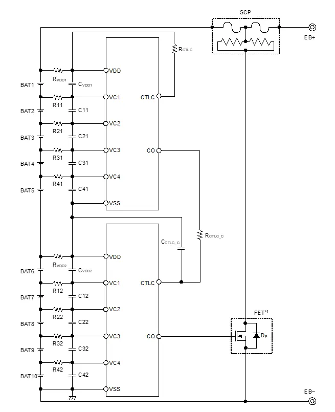 図S-82K5B /M5Bシリーズを用いた10セル直列時の保護回路例