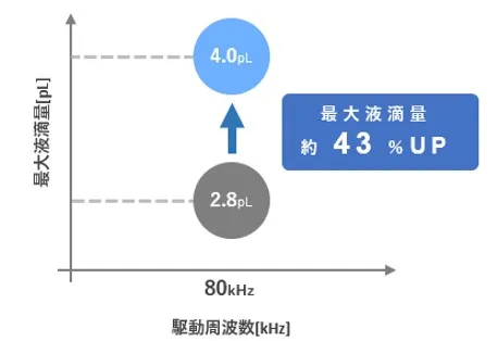 インク流路設計の最適化とヘッド構造の見直しにより、ノズルから吐出されるインクの最大液滴量を、80kHz駆動時、従来品比約43%増の4.0pLまで向上させるとともに、吐出安定性を高めました。ヘッドあたりの生産性を向上させ、商業印刷やパッケージ印刷市場で求められていた液滴量最適化による幅広いメディア対応も可能となりました。