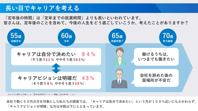 企業からは、役職定年や定年の壁にぶつかって道を見失ってしまったり、モチベーションが下がってしまう「働かないシニア社員」を課題視する声が届きます。一方で当事者は、これまで会社任せのキャリアを築いてきた人など、「自律的キャリア」について考える機会を持てていないケースが多く、そうした備えがないまま役職定年・定年を迎えてしまうことが課題の背景になっています。
