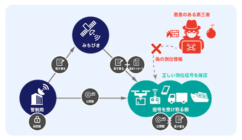 みちびきの信号認証サービスは、電子署名認証技術を活用することで、測位信号の真正を検証することができるサービスです。