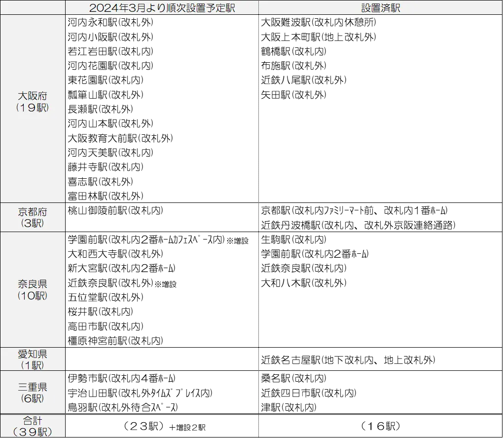 大阪府・京都府・奈良県・愛知県・三重県の近鉄線16駅に、すでに設置をしておりましたが、このたび、新たに23駅増やし、お客さまの利便性のさらなる向上を目指します。