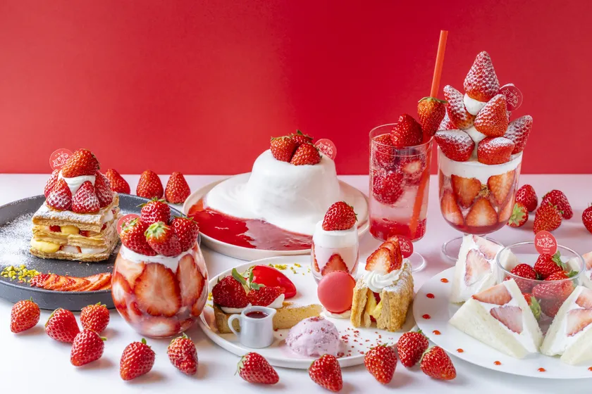 6種のいちごスイーツが楽しめるスイーツプレート。タルトやプリンなど、多様なスイーツでいちごの味わいを堪能できる一皿です。
