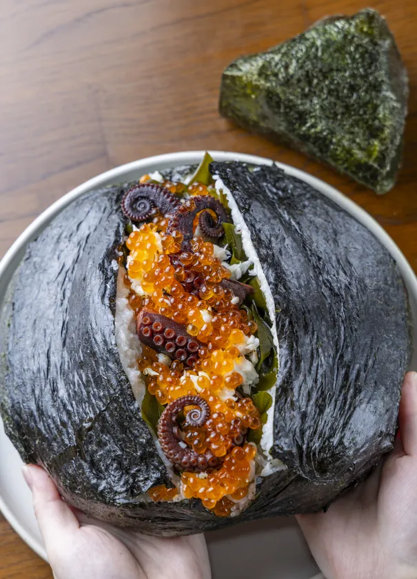 総重量約2kg、通常のおにぎりの約15倍のサイズのばくだんおにぎりです。中には鳴門産の煮わかめ、鯛、蛸、いくらがずっしりと入っており、満足感ナンバー1のおにぎりです。