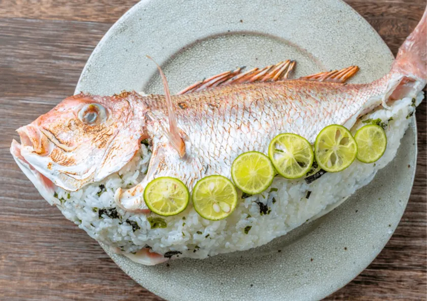 丸ごと1匹の鯛の中に、わかめのおにぎりをお腹がはちきれるほどぎっしりと詰め込んだ、総重量約1.2kgの満足メニューです。