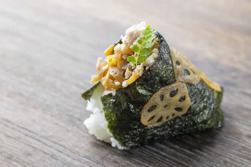 れんこんのシャキシャキ感と阿波鶏そぼろの旨みを凝縮したおにぎりです。