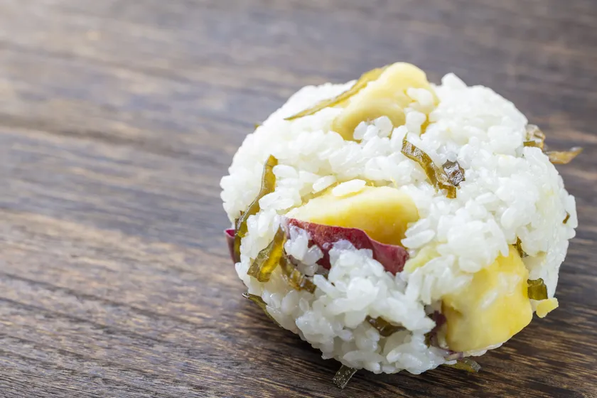 徳島名産の鳴門金時と汐(しお)わかめを混ぜ込んだおにぎりです。鳴門金時の優しい甘みと汐(しお)わかめのしょっぱさが混ざり、甘じょっぱい味わいになっています。