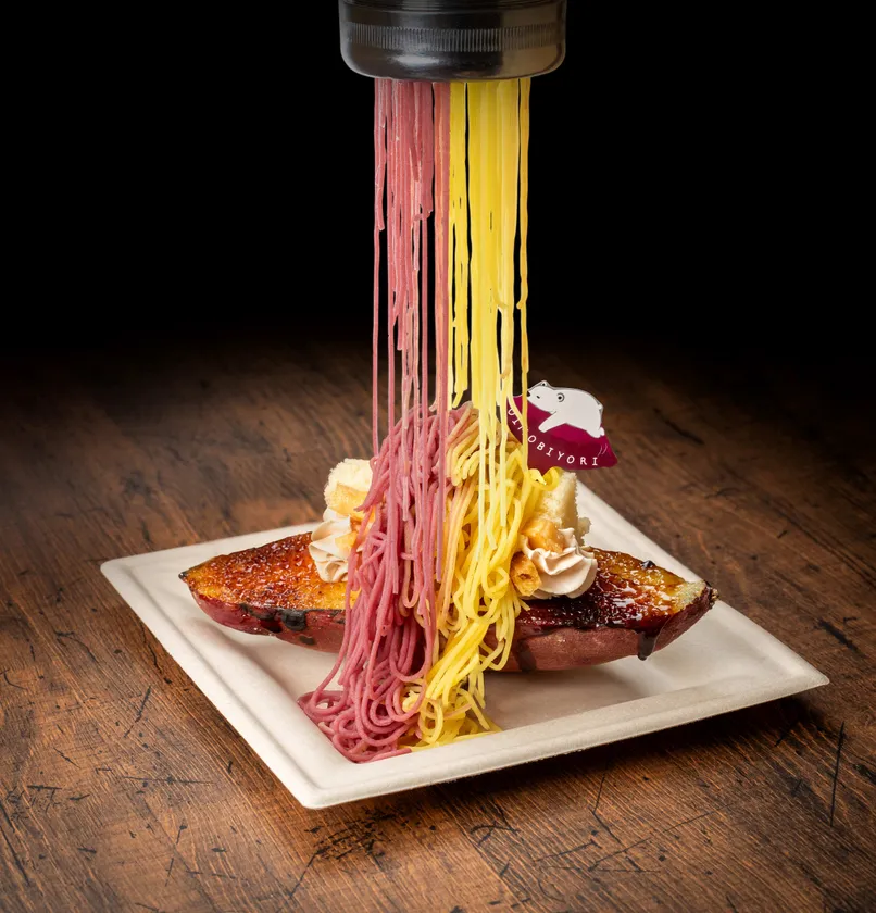 ホクホクの甘いさつまいものトッピングと出汁としてねっとり系の紅はるかを溶かし込み自然な甘さを表現しました。仕上げにバターとパセリのトッピングが全体の味を引き締めます。